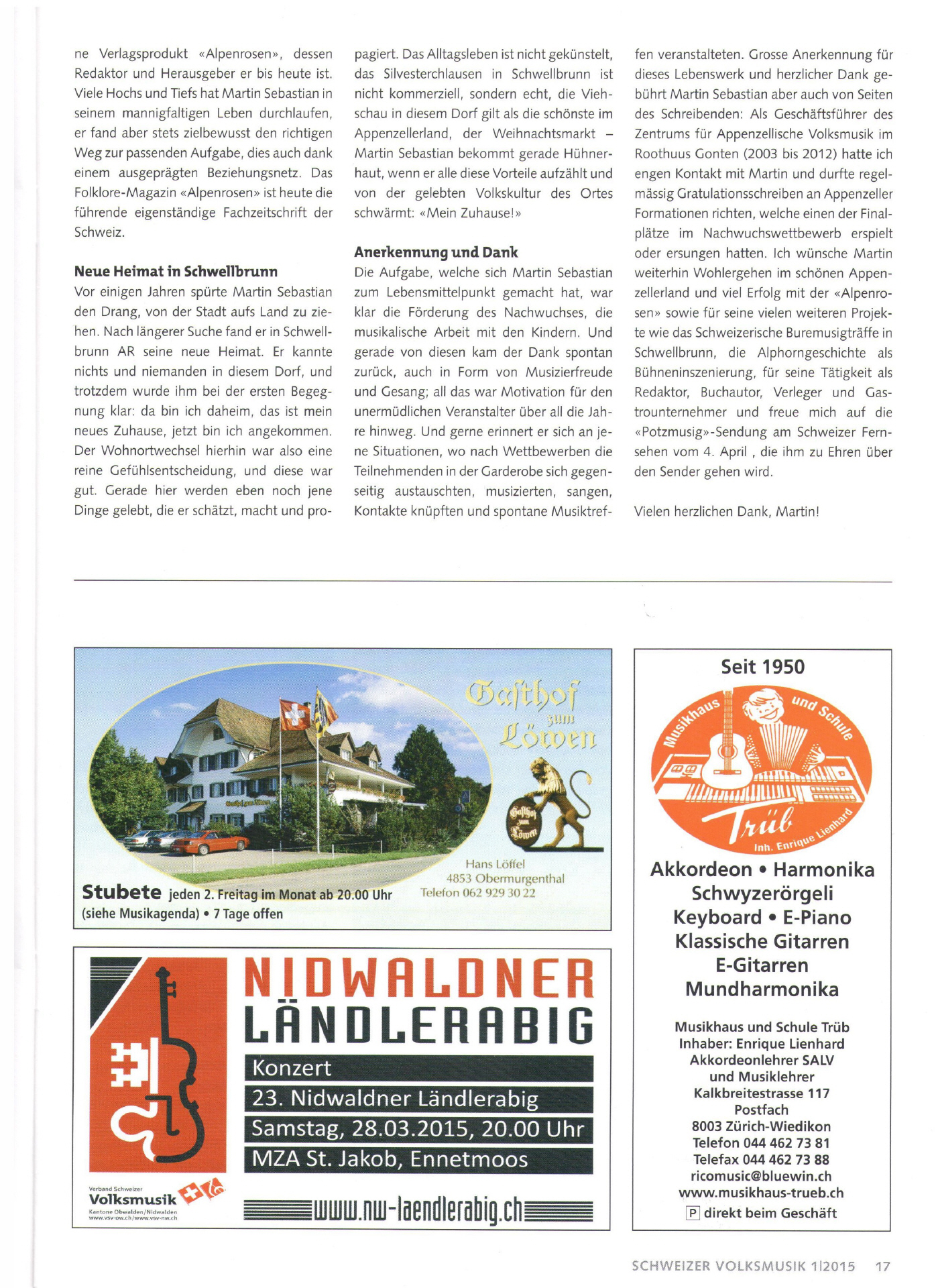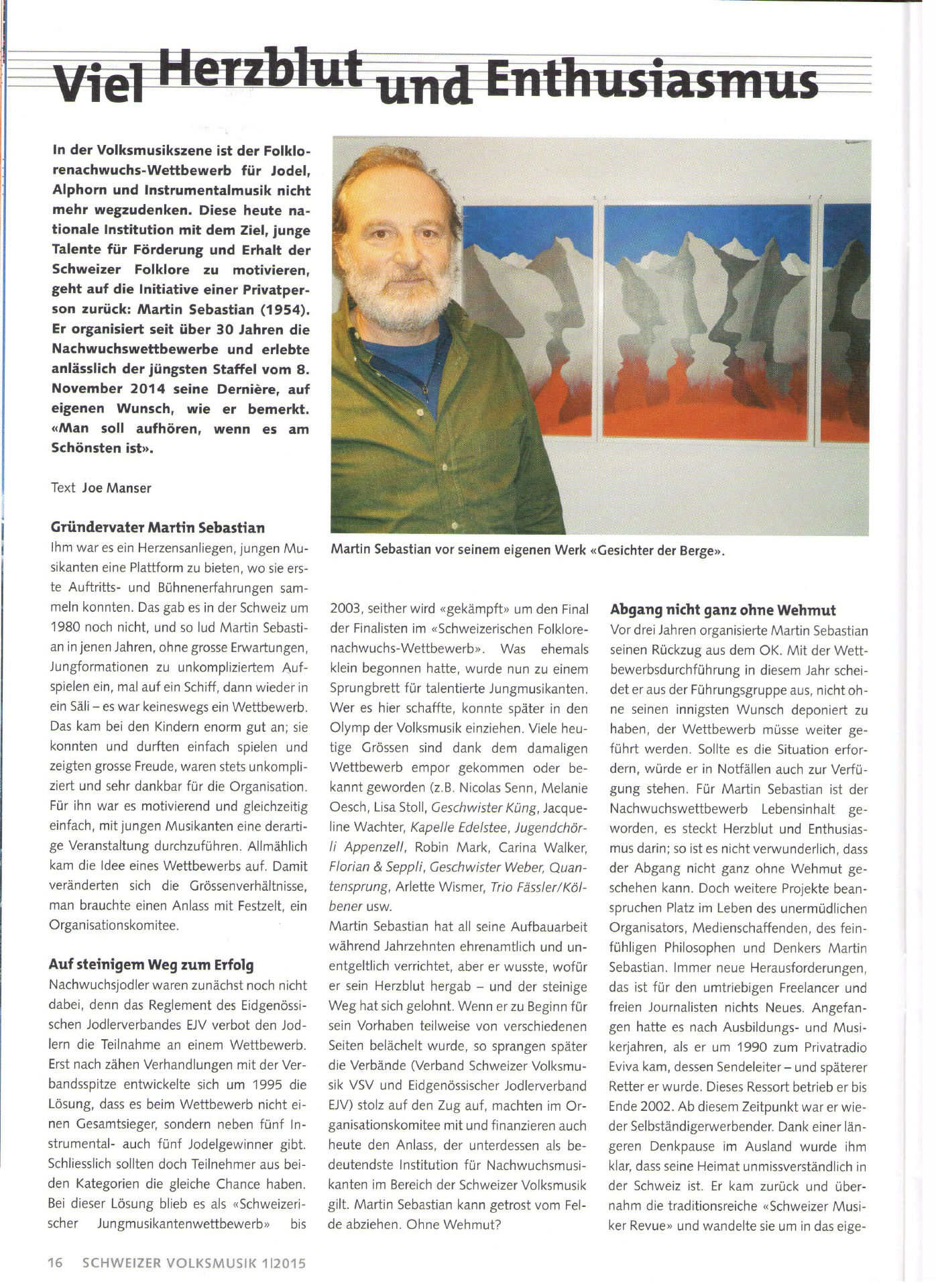 Um den Artikel über Martin Sebastian in Schweizer Volksmusik 1/2015 - die nationale Zeitschrift des Verbandes Schweizer Volksmusik VSV anzuschauen, bitte anklicken: Seite 1